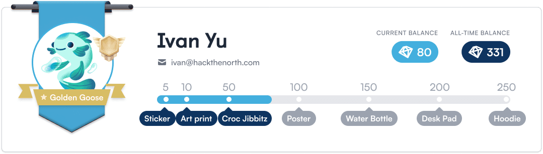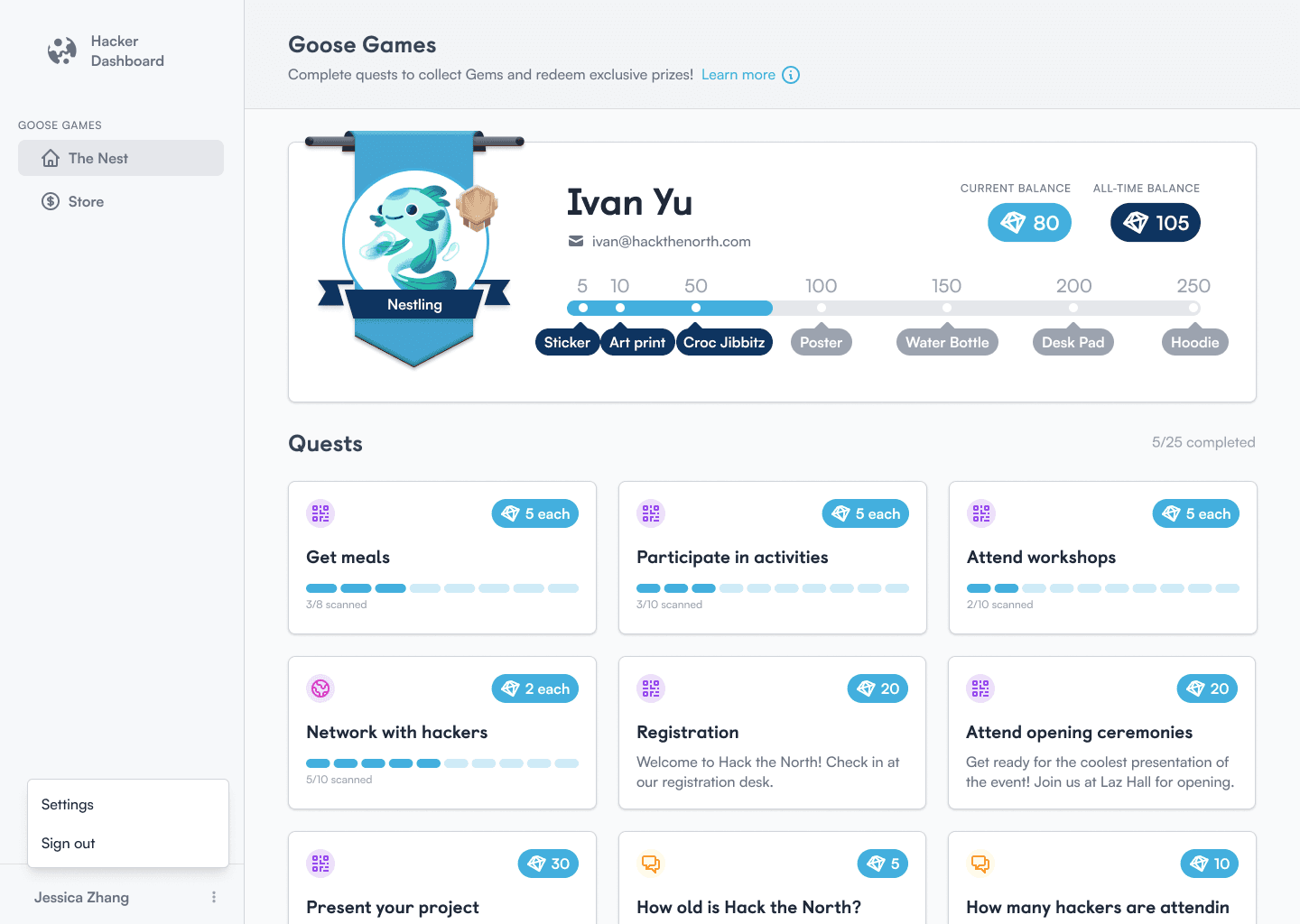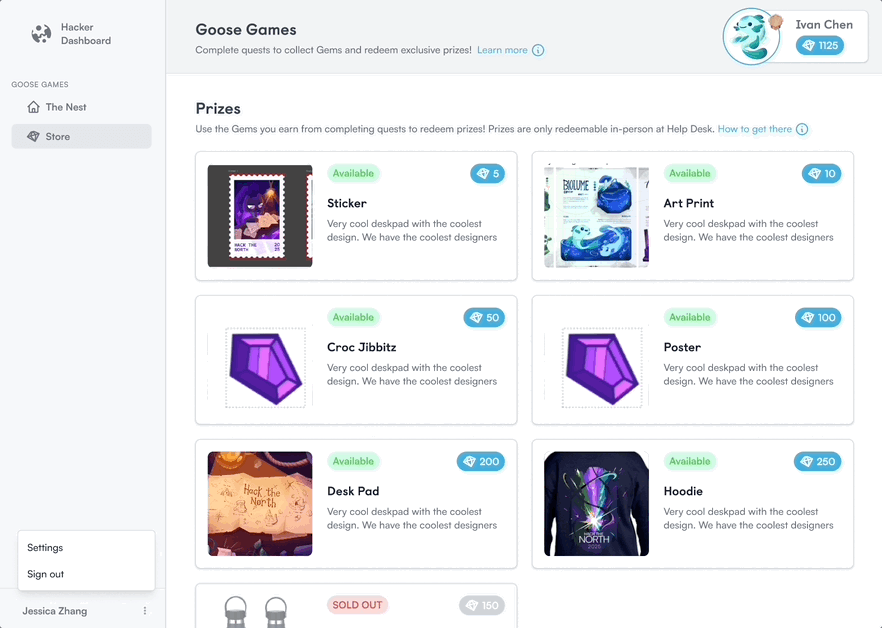 Goose Games is our playful twist on the hackathon experience—an optional quest system where hackers can complete side missions, earn points, and unlock rewards. Whether it’s “Find the golden goose” or “Network with hackers,” organizers craft lighthearted challenges throughout the weekend to keep the energy up. Each completed quest earns points, which hackers can redeem for prizes—many of them custom-designed by our own graphic design team. It’s our way of rewarding engagement and encouraging fun, one quest at a time.